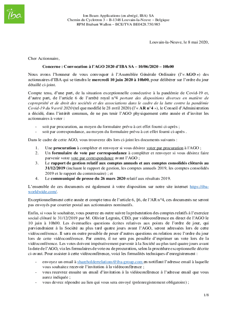 Ion Beam Applications (en BRG, IBA) SA Che min Du Cyclotron 3 B1348 LouvainlaNeuve Belgium RPM Brabant Walton BCE/TVA BE0428.750.985LouvainlaNeuve, LE 8 Mai 2020,Cher Actionable, Concerned : Convocation