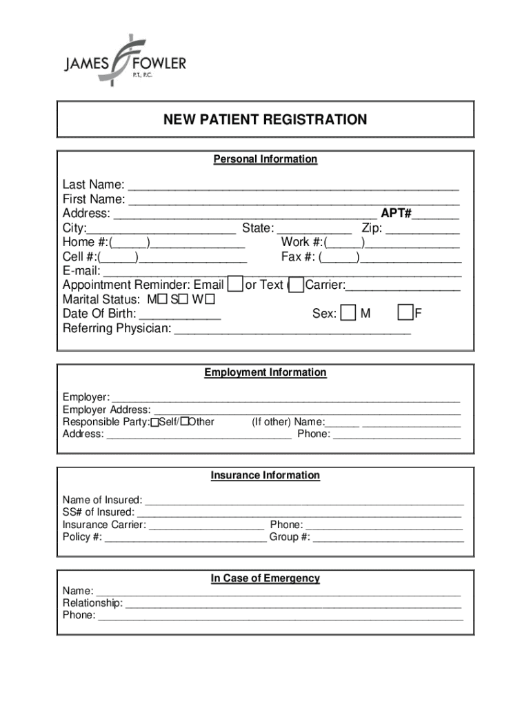 New patient registration can be filled out by providing personal information such as name, contact information, medical history, and insurance details.
