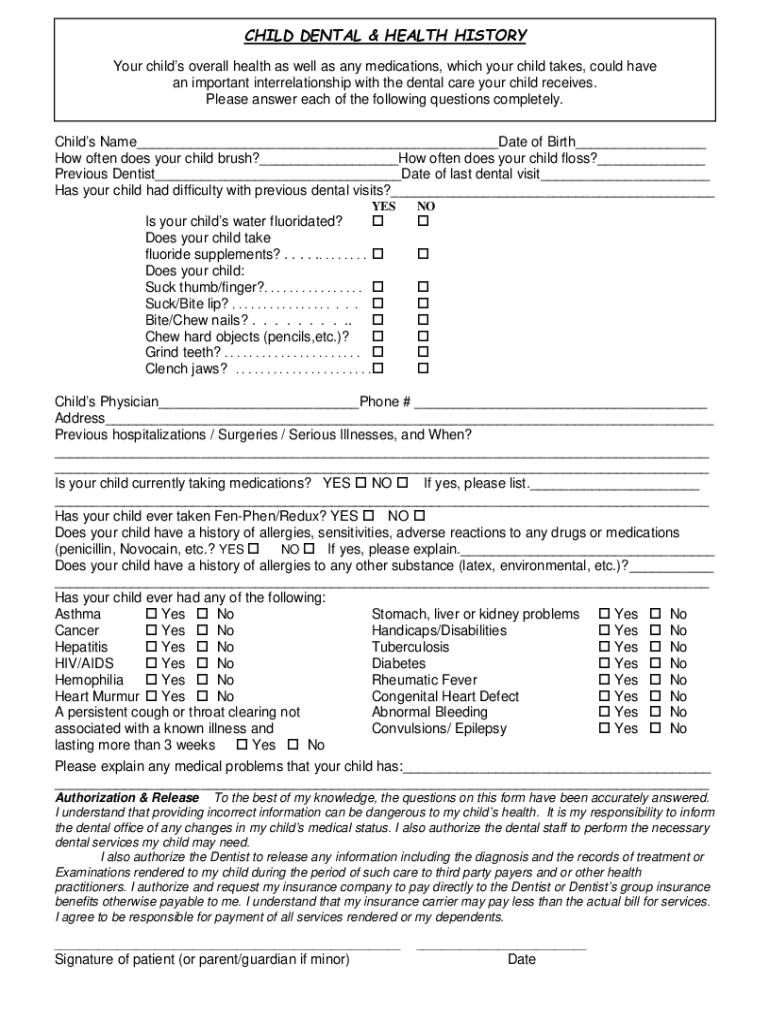 CHILD DENTAL & HEALTH HISTORY Your children overall health as well as any medications, which your child takes, could have an important interrelationship with the dental care your child receives. Please