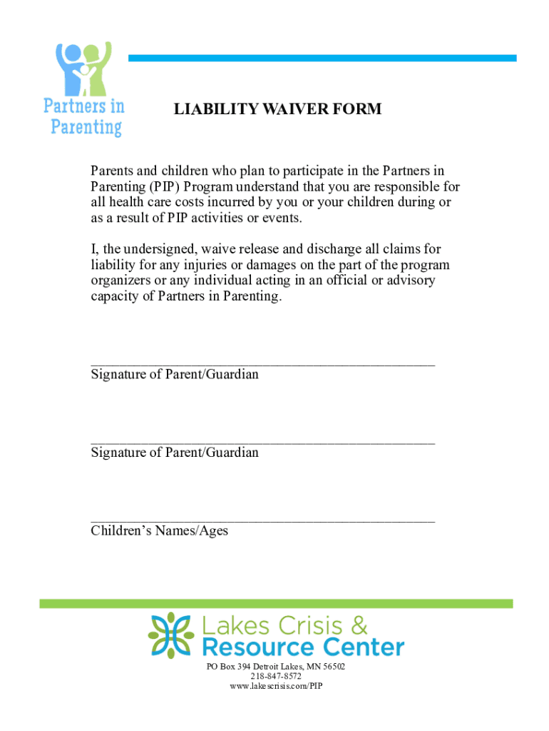 LIABILITY WAIVER Foreparts and children who plan to participate in the Partners in Parenting (PIP) Program understand that you are responsible for all health care costs incurred by you or your children