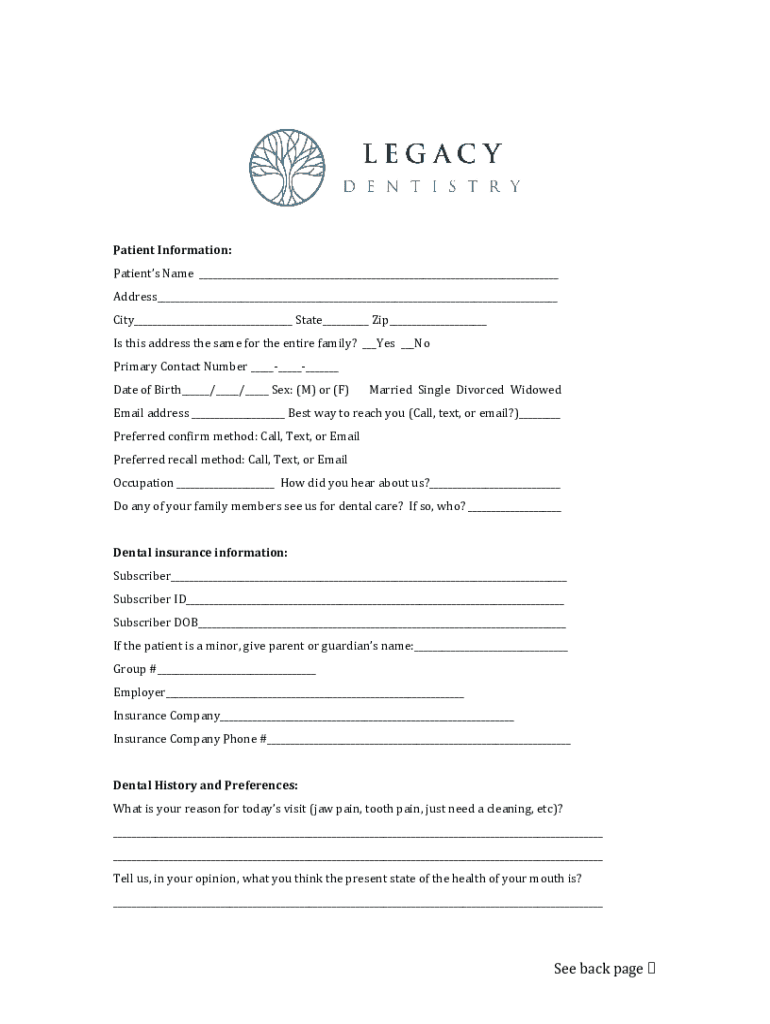 Patient Information: Patients Name Address City State Zip Is this address the same for the entire family? Yes No Primary Contact Number Date of Birth / / Sex: (M) or (F)Married Single Divorced WidowedEmail