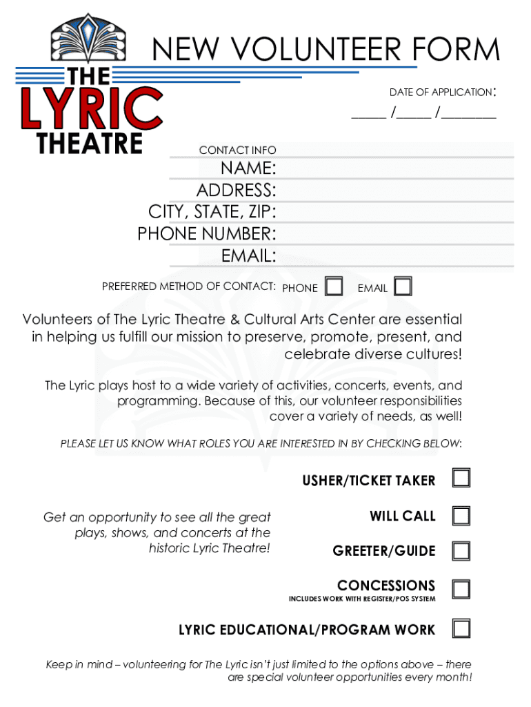 NEW VOLUNTEER FORM DATE OF APPLICATION: / / CONTACT INFLAME: ADDRESS: CITY, STATE, ZIP: PHONE NUMBER: EMAIL: PREFERRED METHOD OF CONTACT: PHONEEMAILVolunteers of The Lyric Theater & Cultural Arts