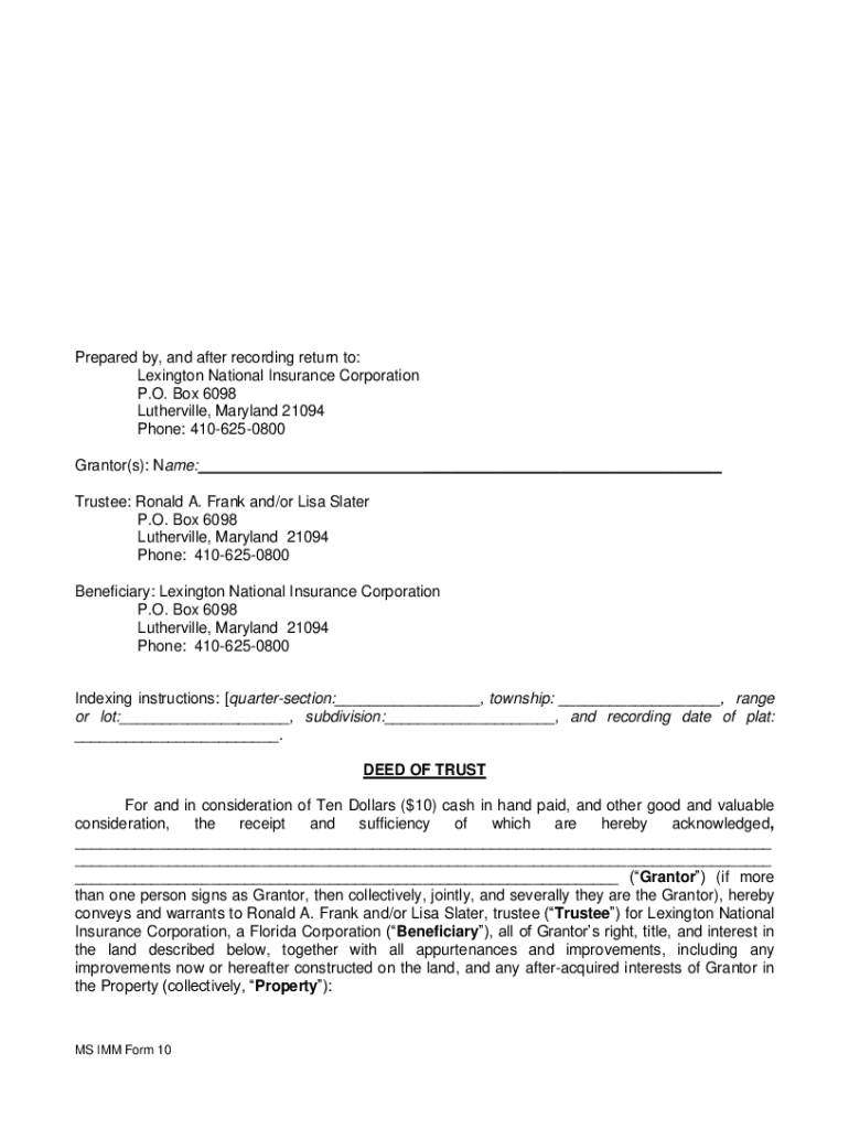 Prepared by, and after recording return to: Lexington National Insurance Corporation P.O. Box 6098 Lukeville, Maryland 21094 Phone: 4106250800 Granter(s): Name: Trustee: Ronald A. Frank and/or Lisa