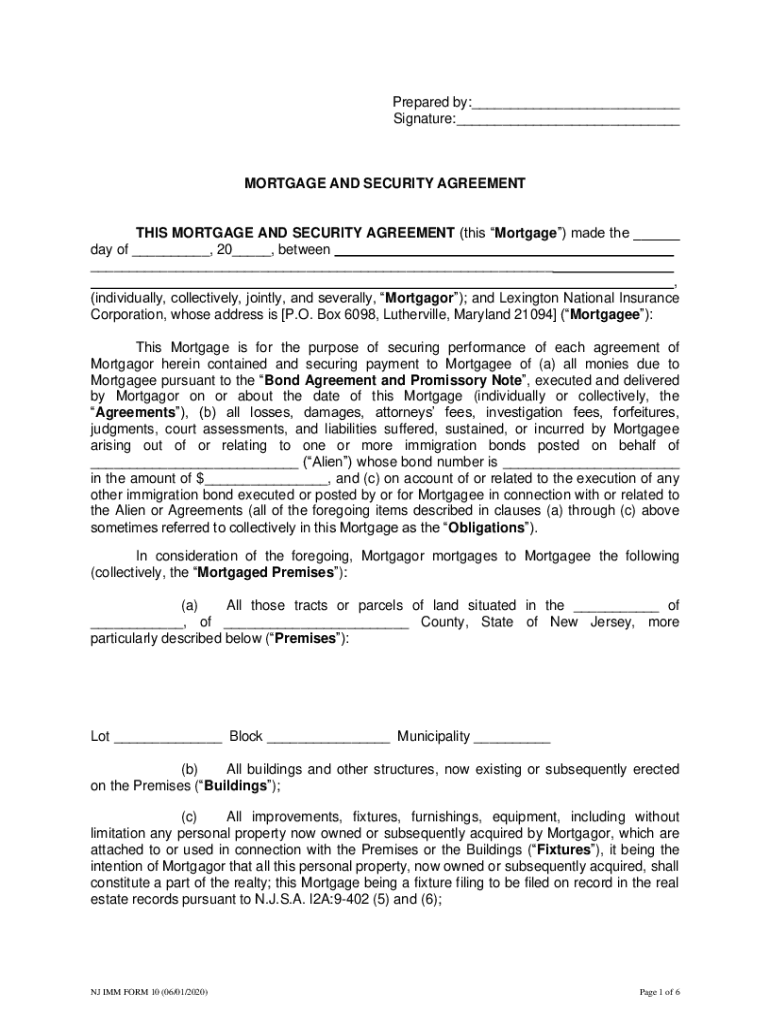 Prepared by: Signature: MORTGAGE AND SECURITY AGREEMENT THIS MORTGAGE AND SECURITY AGREEMENT (this Mortgage) made the day of, 20, between, (individually, collectively, jointly, and severally, Mortgagor);
