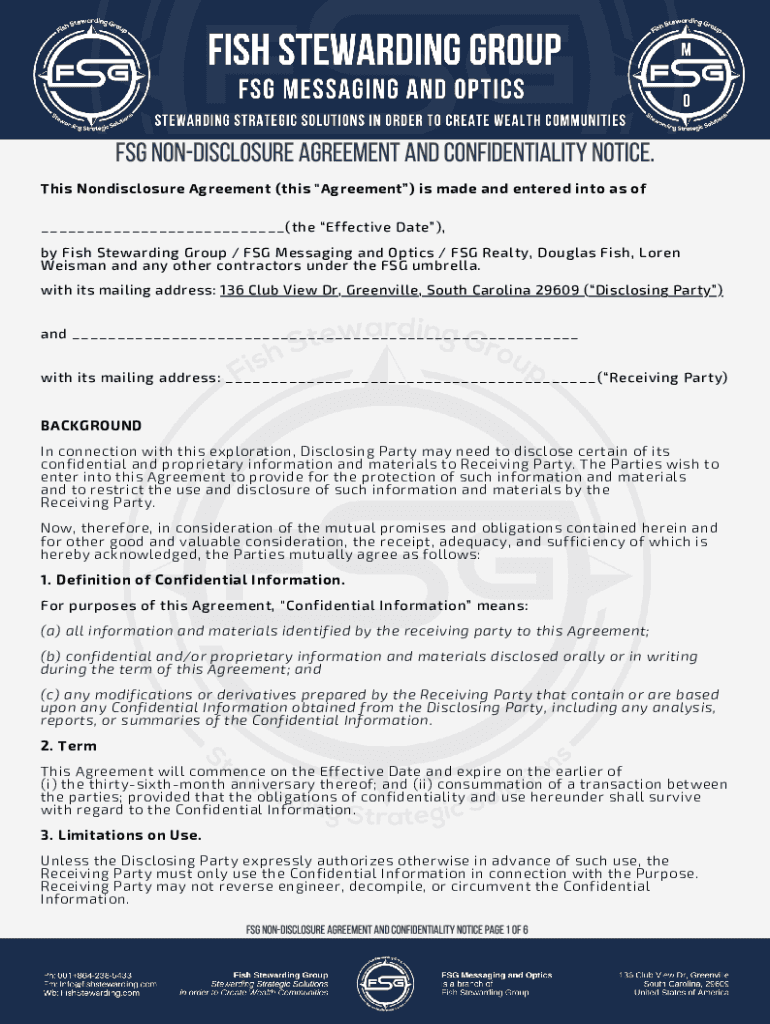 FSG Nondisclosure Agreement and Confidentiality Notice. This Nondisclosure Agreement (this “Agreement) is made and entered into as of (the Effective Date), by Fish Stewarding Group / FSG Messaging