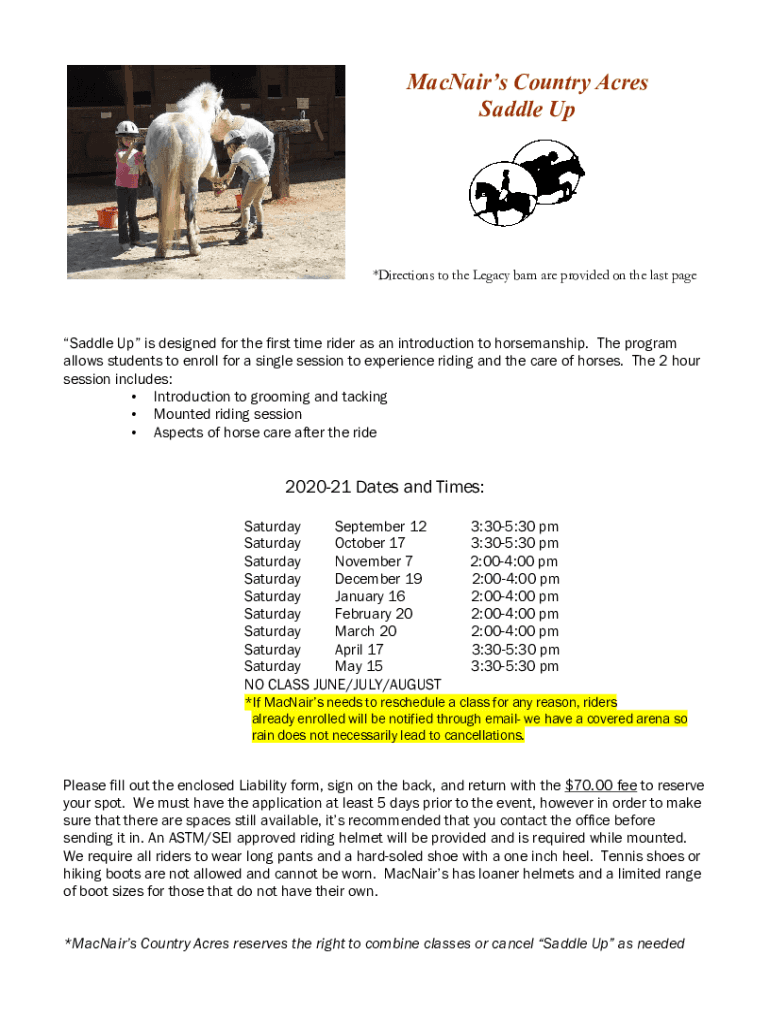 Manages Country Acres Saddle Up×Directions to the Legacy barn are provided on the last packsaddle Up is designed for the first time rider as an introduction to horsemanship. The program allows students