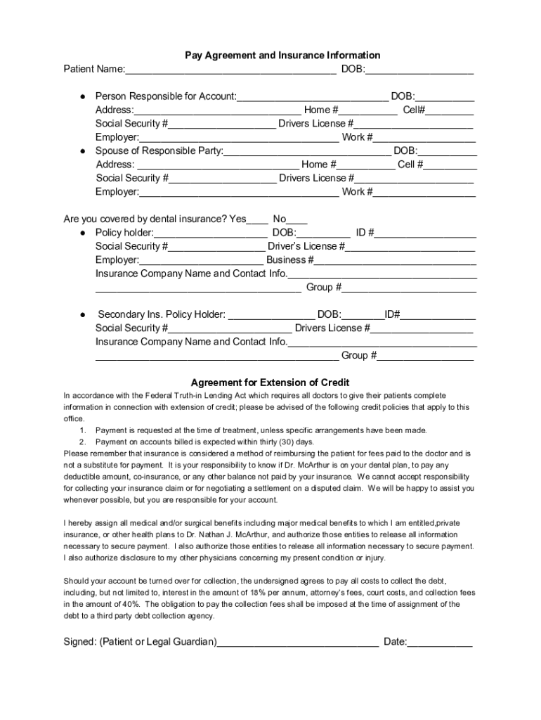 Pay Agreement and Insurance Information Patient Name: DOB: Person Responsible for Account: DOB: Address: Home # Cell# Social Security # Driver's License # Employer: Work # Spouse of Responsible Party: