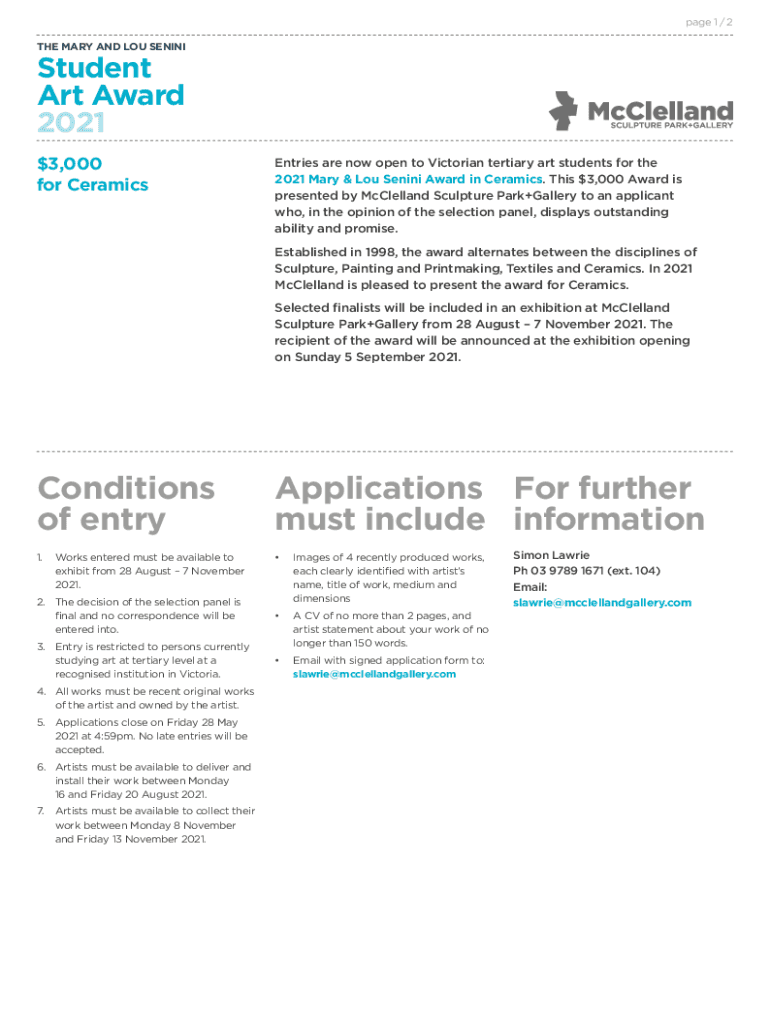 Page 1 / 2THE MARY AND LOU SENINIStudent Art Award $20213,000 for CeramicsEntries are now open to Victorian tertiary art students for the 2021 Mary & Lou Senior Award in Ceramics. This $3,000 Award