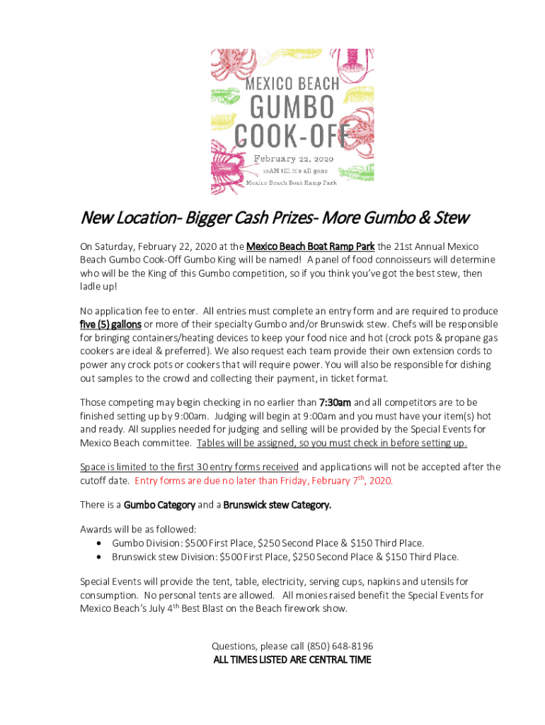 New Location Bigger Cash Prizes More Gumbo & Stew On Saturday, February 22, 2020, at the Mexico Beach Boat Ramp Park the 21st Annual Mexico Beach Gumbo Cookout Gumbo King will be named! A panel of
