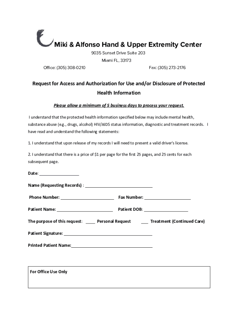 Miki&AlfonsoHand&UpperExtremityCenter 9035SunsetDriveSuite203 Miami FL,33173 Office:(305)3080210Fax:(305)2732176Request for Access and Authorization for Use and/or Disclosure of Protected Health Information