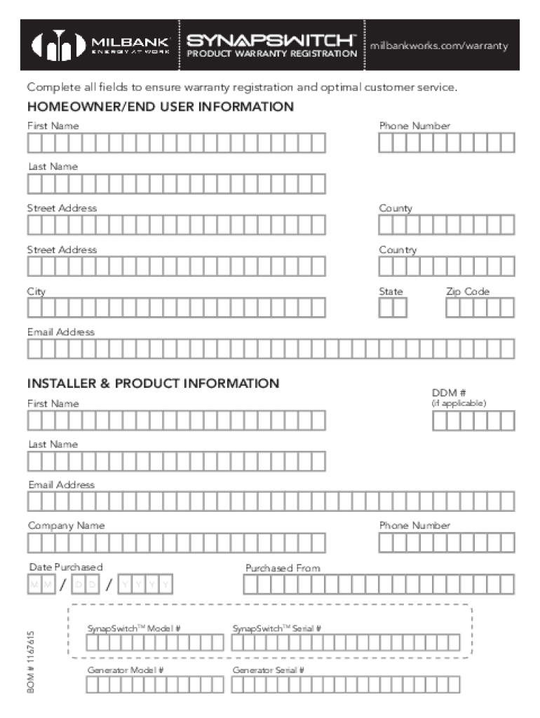 Product Warranty Registrationmilbankworks.com/warrantyComplete all fields to ensure warranty registration and optimal customer service.HOMEOWNER/END USER INFORMATION Phone NumberFirst Nameless Backstreet