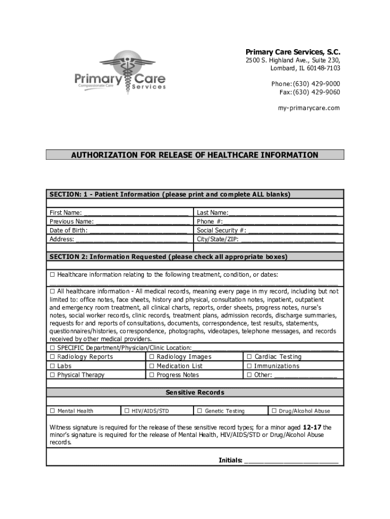 Primary Care Services, S.C. 2500 S. Highland Ave., Suite 230, Lombard, IL 601487103 Phone:(630) 4299000 Fax:(630) 4299060 myprimarycare. Authorization FOR RELEASE OF HEALTHCARE INFORMATIONSECTION: