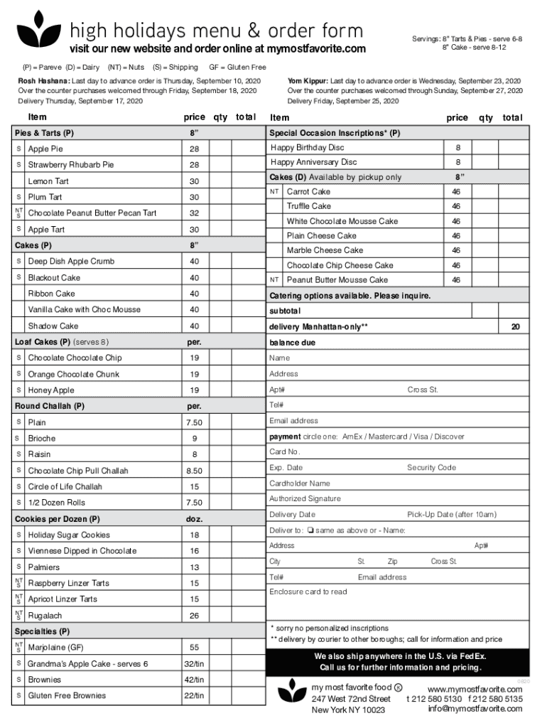 High holidays menu & order formServings: 8 Tarts & Pies serve 68 8 Cake serve 812visit our new website and order online at mymostfavorite.com (P) Pierre (D) Dairy(NT) Nuts(S) Shipping Gluten Freedom