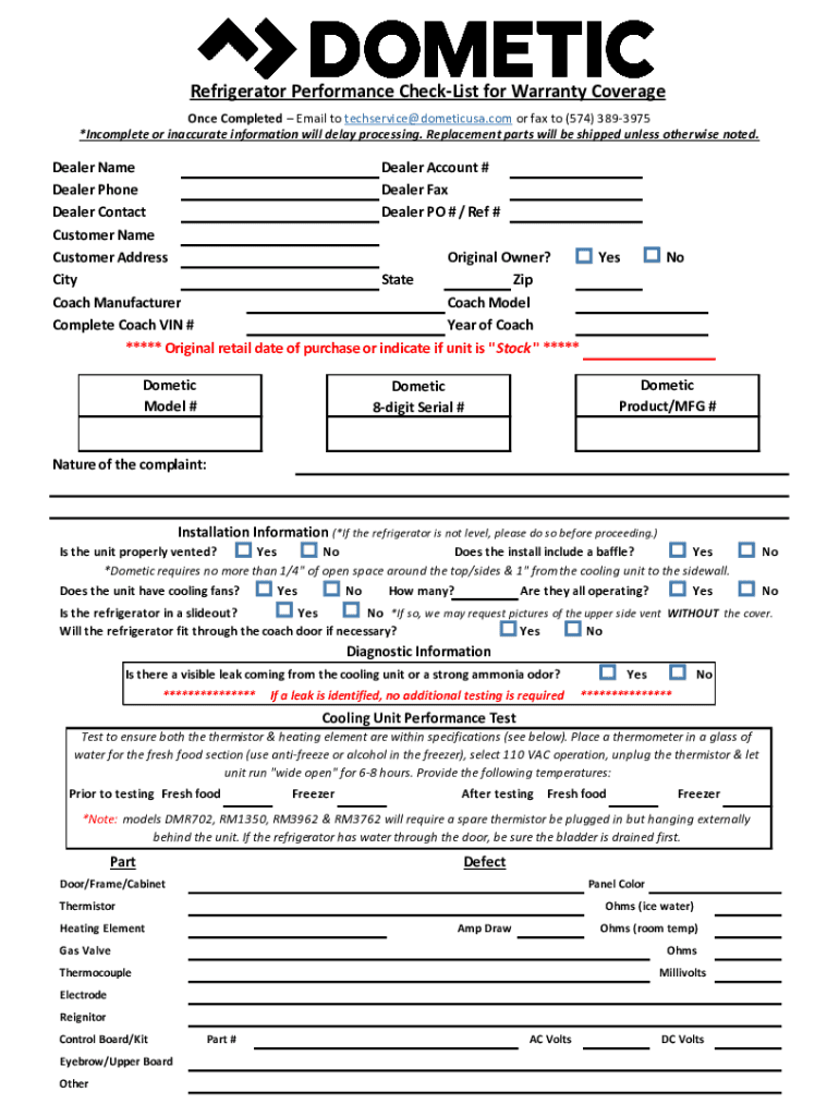 Refrigerator Performance Checklist for Warranty Coverage Once Completed Email to tech service dometicusa.com or fax to (574) 3893975 *Incomplete or inaccurate information will delay processing. Replacement
