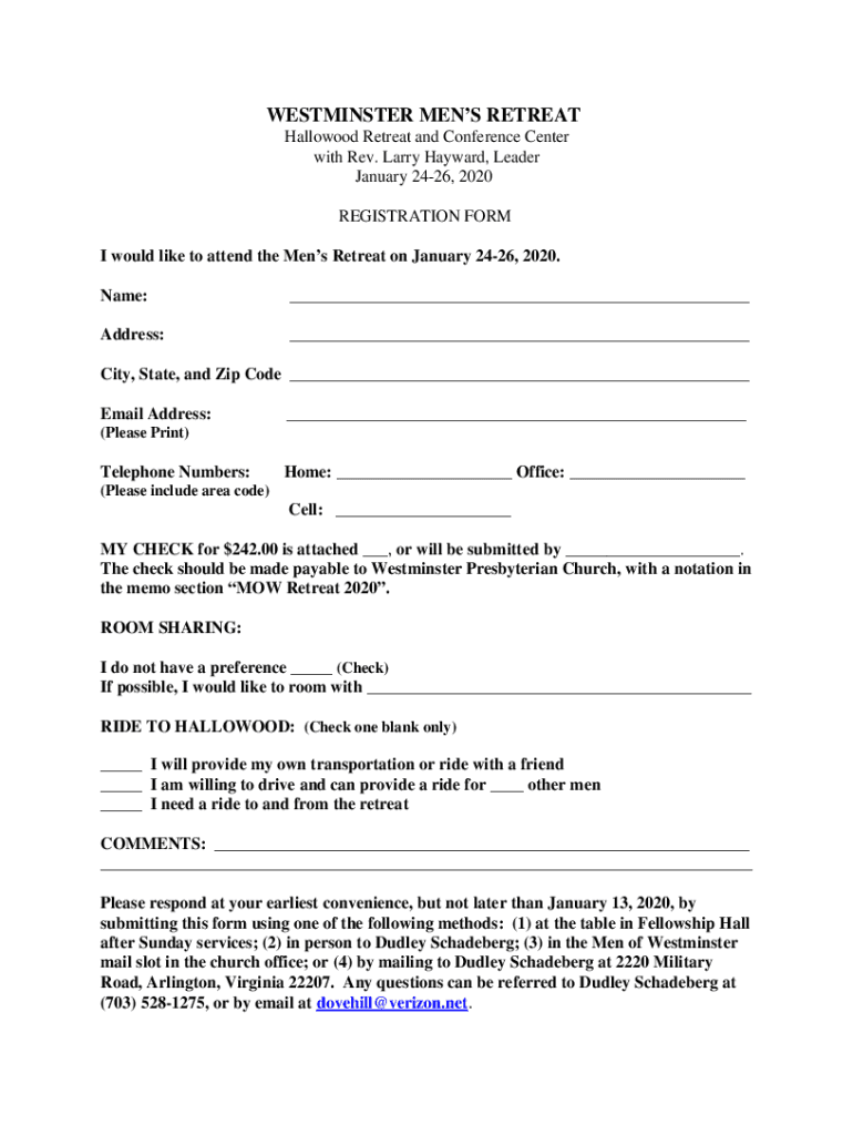 WESTMINSTER MEN RETREAT Hollywood Retreat and Conference Center with Rev. Larry Hayward, Leader January 2426, 2020 REGISTRATION FORM I would like to attend the Men Retreat on January 2426, 2020. Name: