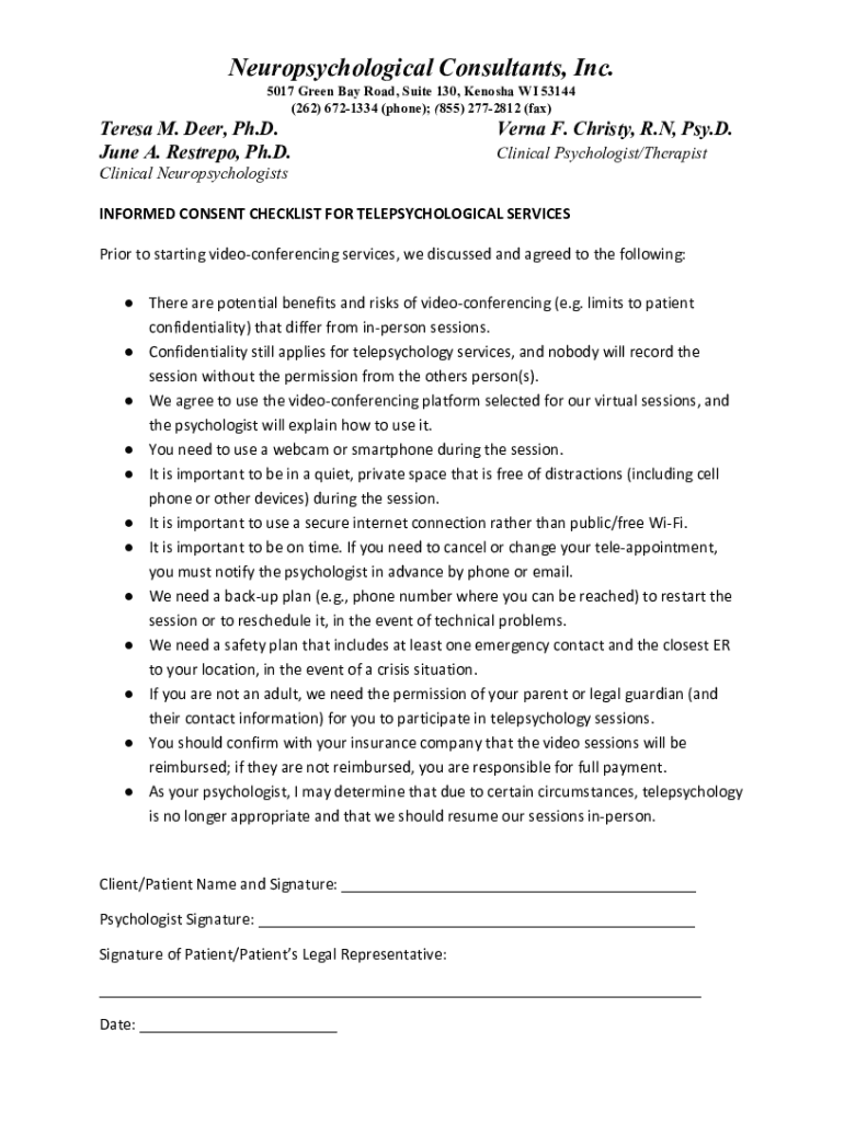 Neuropsychological Consultants, Inc. 5017 Green Bay Road, Suite 130, Kenosha WI 53144 (262) 6721334 (phone); (855) 2772812 (fax)Teresa M. Deer, Ph.D. June A. Restored, Ph.D. Verna F. Christy, R. N,