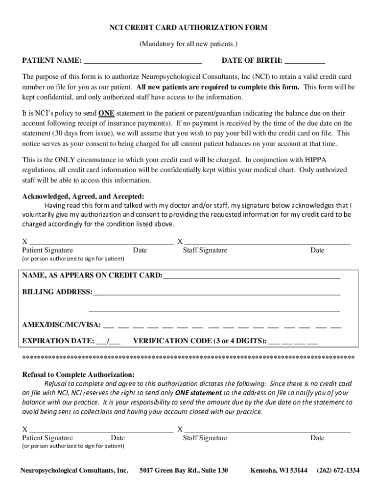 NCI CREDIT CARD AUTHORIZATION FORM (Mandatory for all new patients.) PATIENT NAME: DATE OF BIRTH: The purpose of this form is to authorize Neuropsychological Consultants, Inc (NCI) to retain a valid