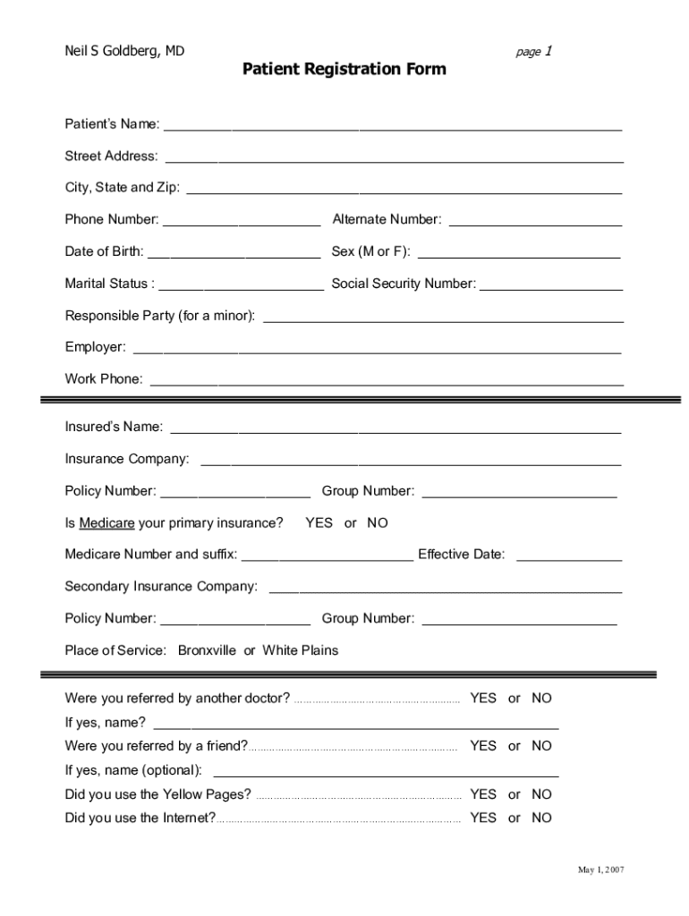 Page 1Neil S Goldberg, Patient Registration Form Patients Name: Street Address: City, State and Zip: Phone Number: Alternate Number: Date of Birth: Sex (M or F): Marital Status : Social Security Number: