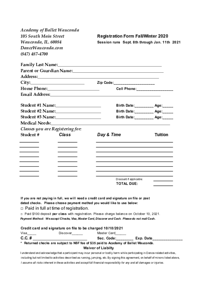 Academy of Ballet Wanda 105 South Main Street Wanda, IL. 60084 DanceWauconda.com (847) 4874700Registration Form Fall/Winter 2020 Session runs Sept. 8th through Jan. 11th 2021Family Last Name: Parent