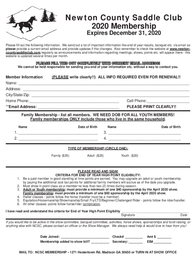Newton County Saddle Club 2020 Membership Expires December 31, 2020, Please fill out the following information. We send out a lot of important information like end of year results, banquet etc. via