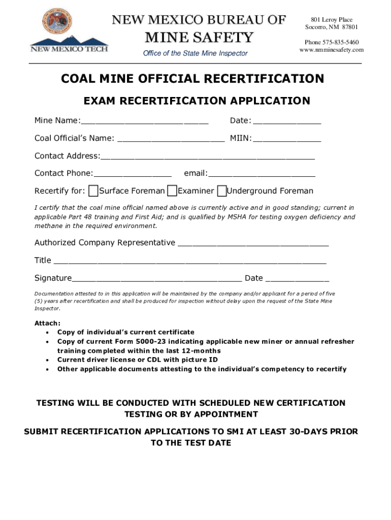 801 Leroy Place Socorro, NM 87801Office of the State Mine InspectorPhone 5758355460 www.nmminesafety.comCOAL MINE OFFICIAL RECERTIFICATION EXAM RECERTIFICATION APPLICATION Mine Name: Date: Coal Officials
