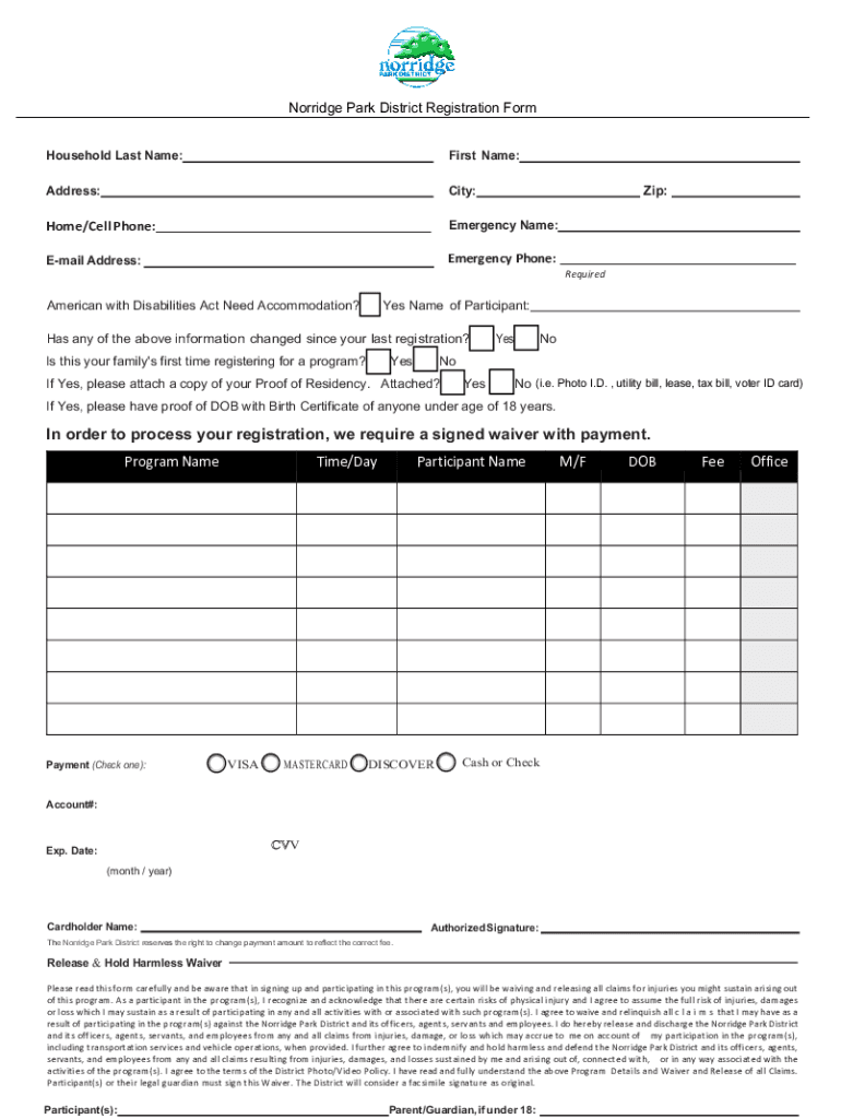 Norridge park district registration can be filled out online, in person at the park district office, or through mail by following the instructions provided on the registration form.