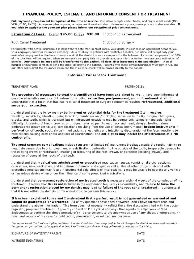 FINANCIAL POLICY, ESTIMATE, AND INFORMED CONSENT FOR TREATMENT Full payment / co-payment is required at the time of service. Our office accepts cash, checks, and major credit cards (MC, VISA, DISC,