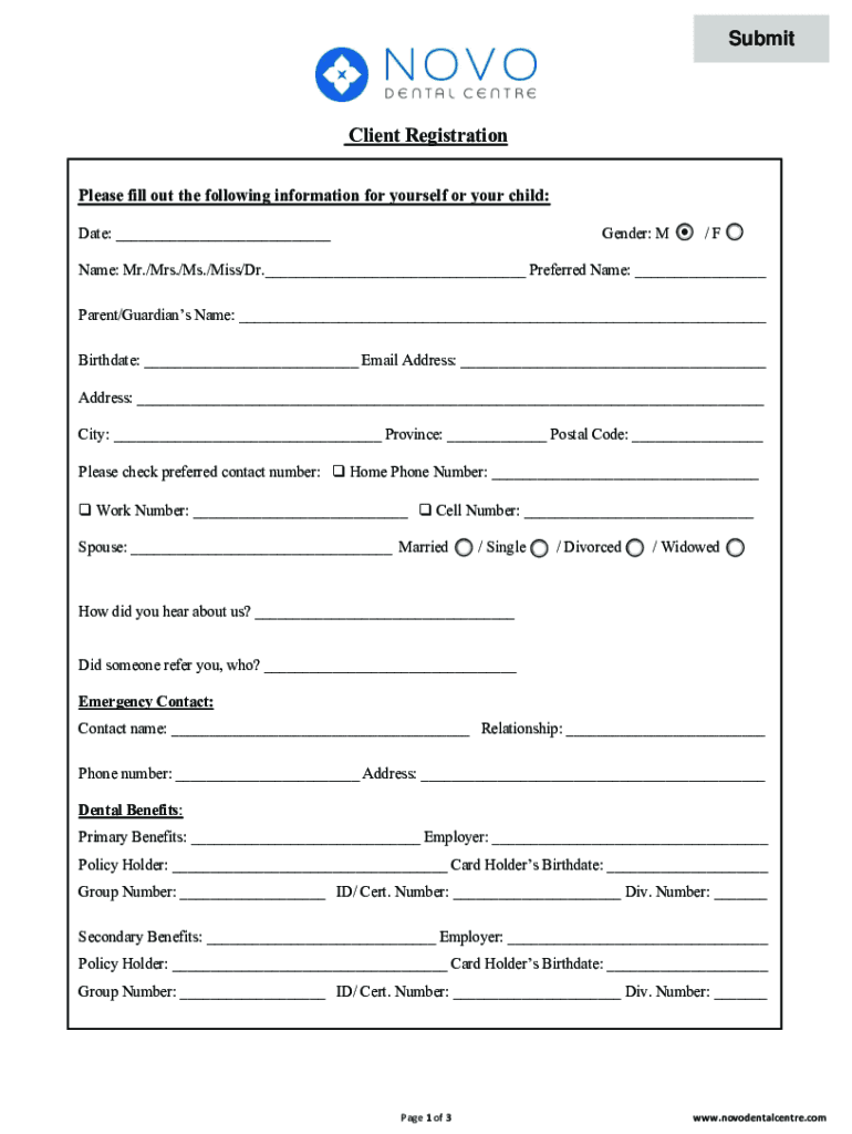 SubmitClient Registration Please fill out the following information for yourself or your child: Date: Gender: M/Name: Mr./Mrs./Ms./Miss/Dr. Preferred Name: Parent/Guardians Name: Birthdate: Email