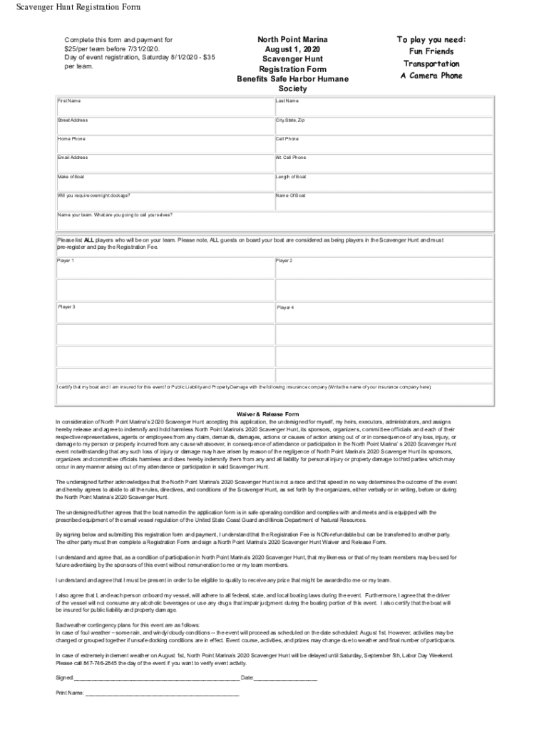 Scavenger Hunt Registration FormComplete this form and payment for $25/per team before 7/31/2020. Day of event registration, Saturday 8/1/$202035 per team. North Point Marina August 1, 2020, Scavenger