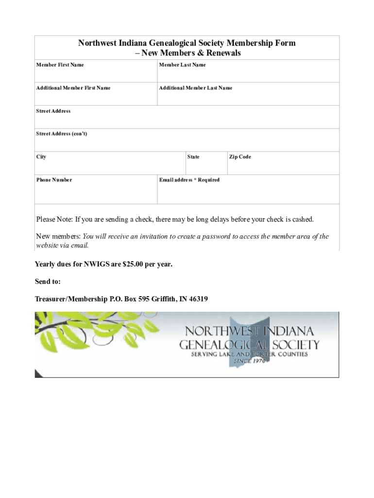 Northwest Indiana Genealogical Society Membership Form New Members & Renewals Member First Remember Last NameAdditional Member First NameAdditional Member Last Backstreet AddressStreet Address (con