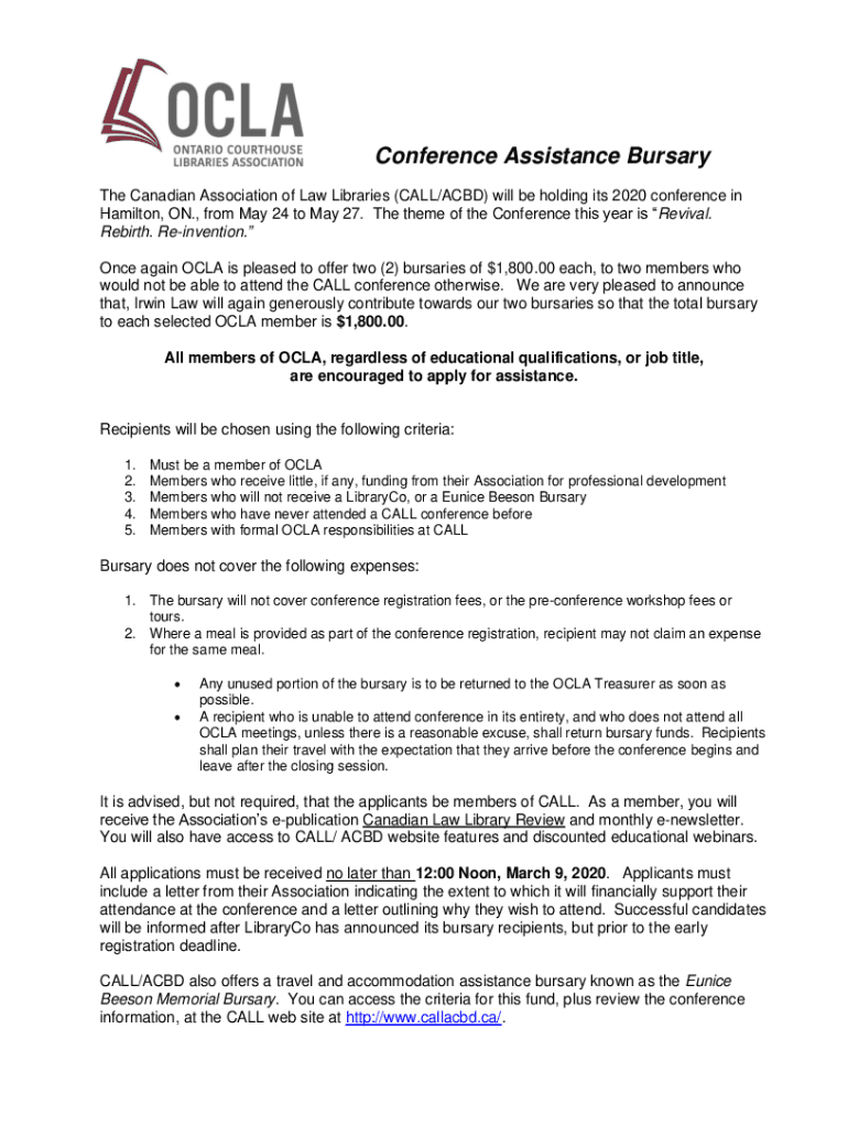 The Canadian Association of Law Libraries (CALL/ACID) will be holding its 2020 conference in
