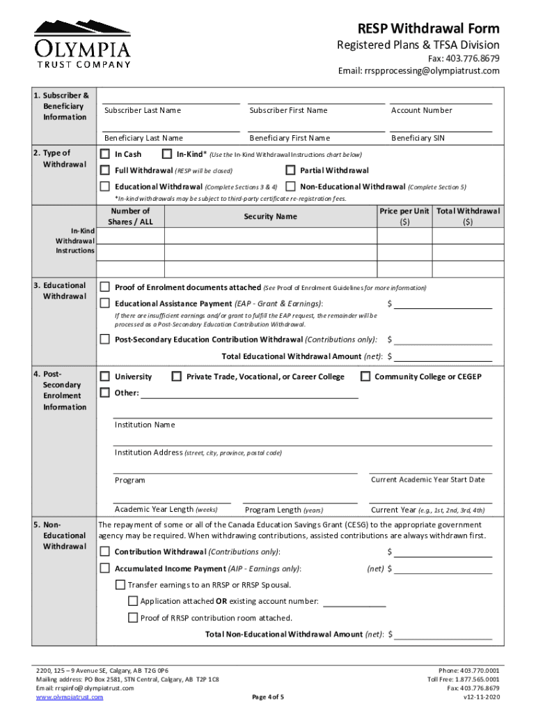 RESP Withdrawal Preregistered Plans & FSA Divisional: 403.776.8679 Email: reprocessing olympiatrust. General Information Fees for withdrawals are outlined in the Olympia Trust Company Fee Schedule.