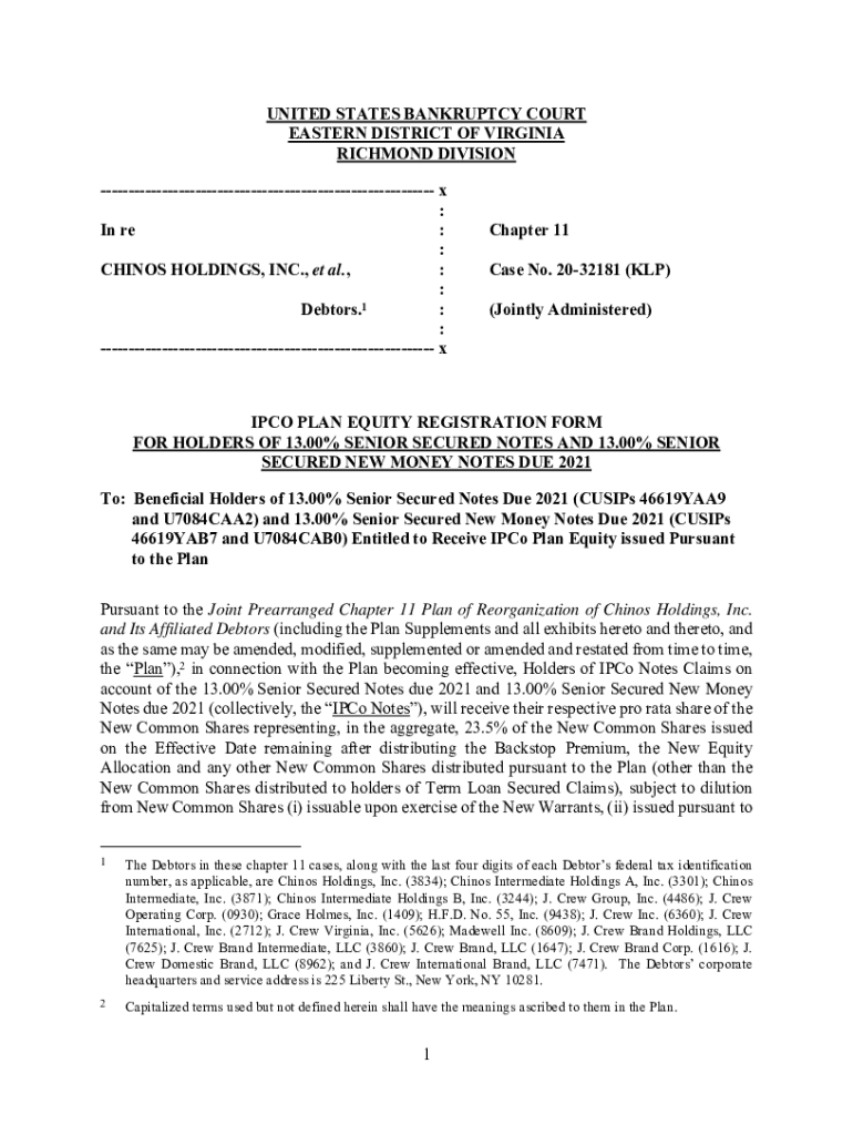 UNITED STATES BANKRUPTCY COURT EASTERN DISTRICT OF VIRGINIA RICHMOND DIVISION x : In re : : CHINOS HOLDINGS, INC., et al., : : : Debtors.1 : chapter 11 Case No. 2032181 (KLM) (Jointly Administered)IPO