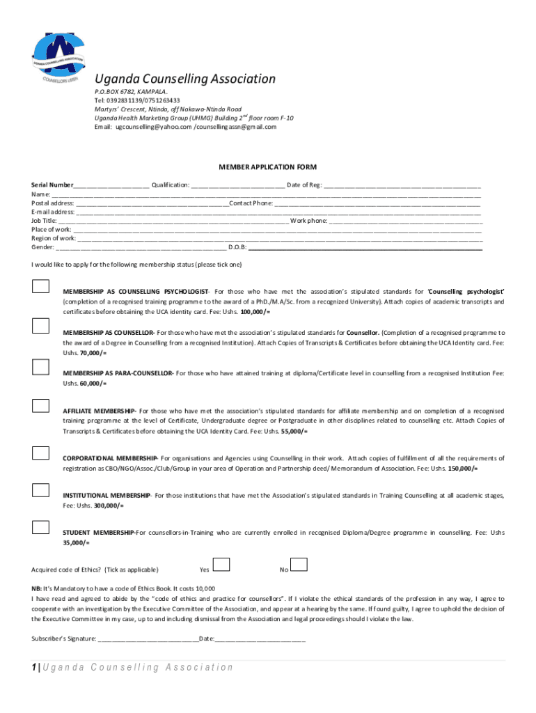 Obtain the application form for Uganda Counselling Association from their website or office.