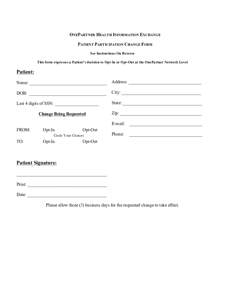 PARTNER HEALTH INFORMATION EXCHANGE PATIENT PARTICIPATION CHANGE FORM See Instructions On Reverse This form expresses a Patients decision to Option or Opt-out at the Partner Network LevelPatient:
