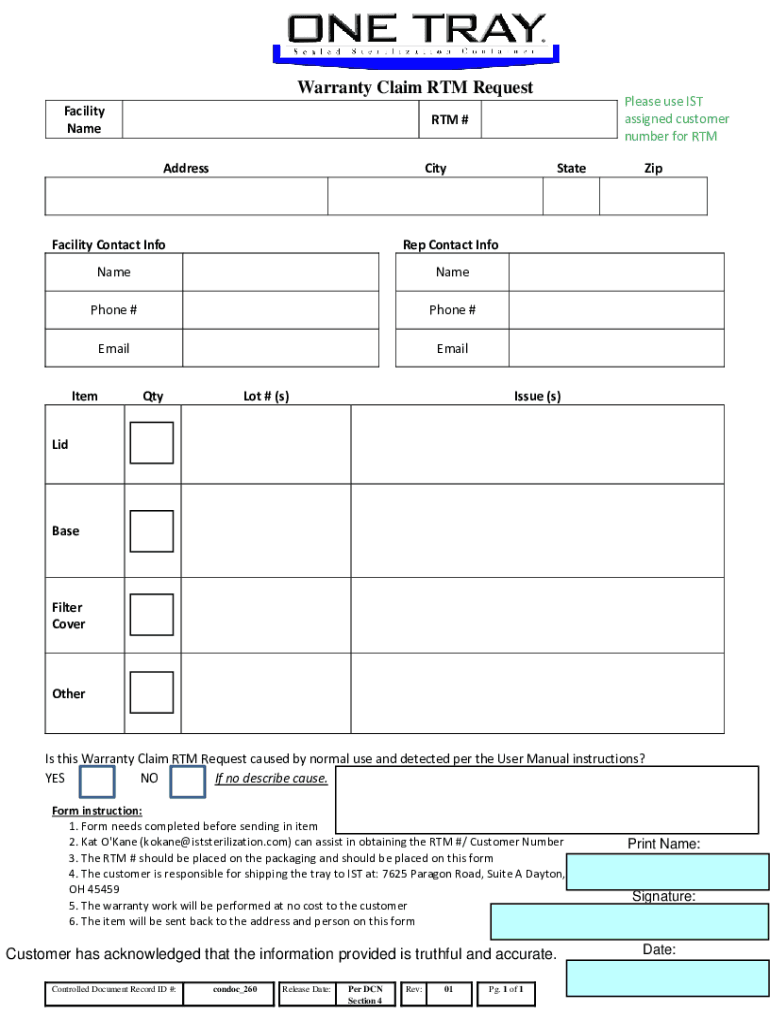Get the free Warranty Claim RTM Request - ONE TRAY