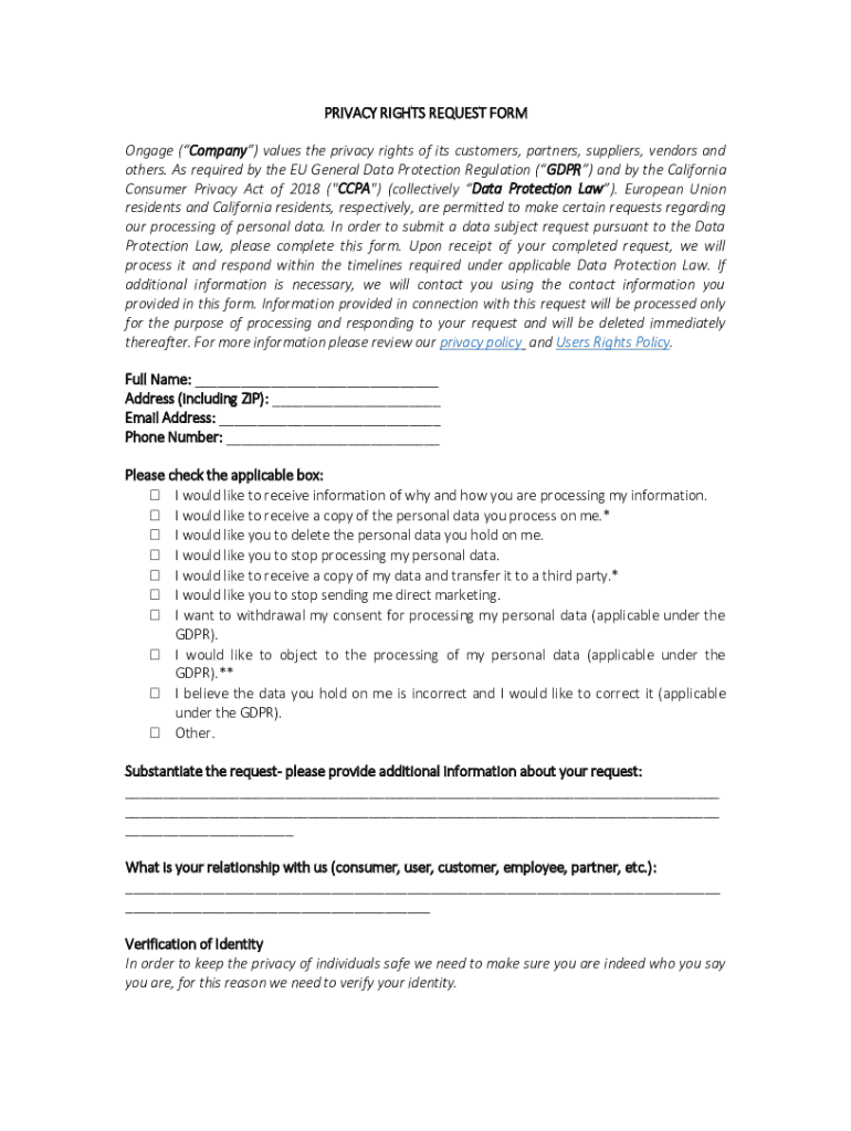 PRIVACY RIGHTS REQUEST FORM Engage (Company) values the privacy rights of its customers, partners, suppliers, vendors and others. As required by the EU General Data Protection Regulation (GDPR) and