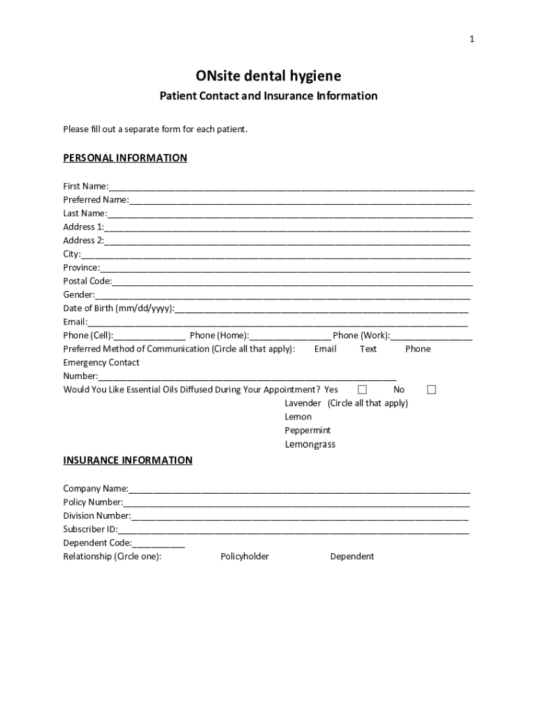 1ONsite dental hygiene Patient Contact and Insurance Information Please fill out a separate form for each patient. PERSONAL INFORMATION First Name: Preferred Name: Last Name: Address 1: Address 2:
