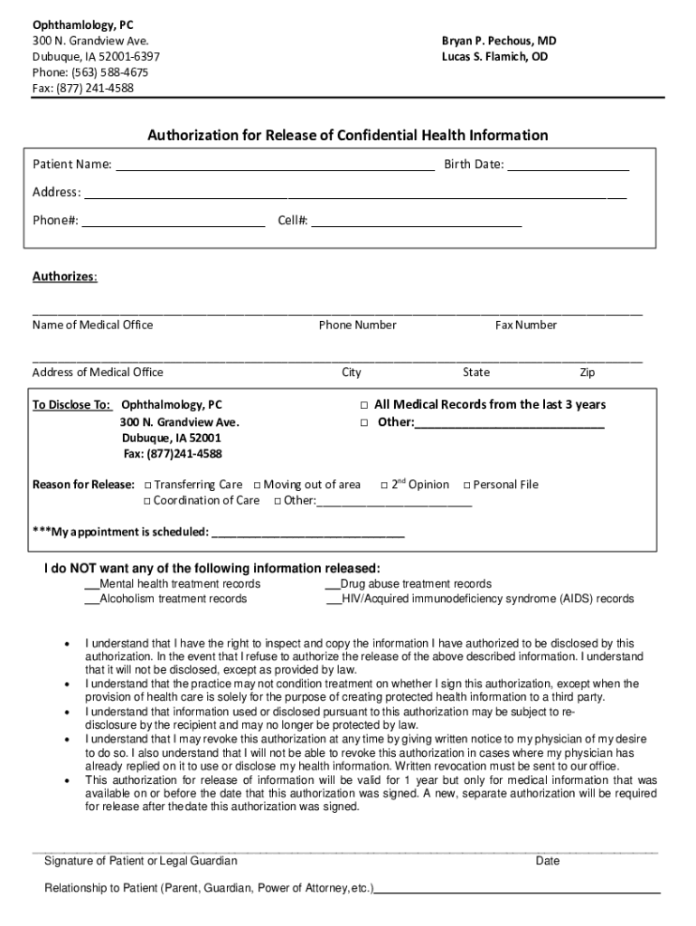 Ophthalmology, PC 300 N. Grandview Ave. Dubuque, IA 520016397 Phone: (563) 5884675 Fax: (877) 2414588Bryan P. Precious, MD Lucas S. Flemish, Authorization for Release of Confidential Health Information