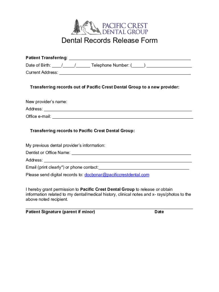 Dental Records Release Form Patient Transferring: Date of Birth: / / Telephone Number: () Current Address: Transferring records out of Pacific Crest Dental Group to a new provider: New providers name: