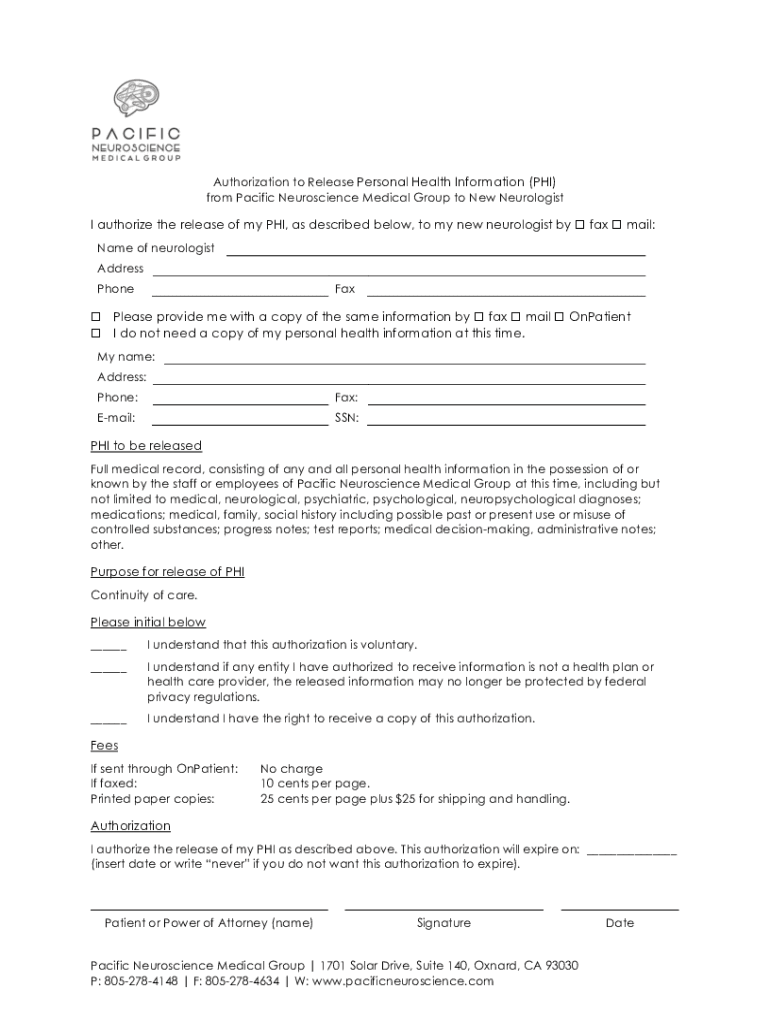 Authorization to Release Personal Health Information (PHI) from Pacific Neuroscience Medical Group to New Neurologist authorize the release of my PHI, as described below, to my new neurologist by