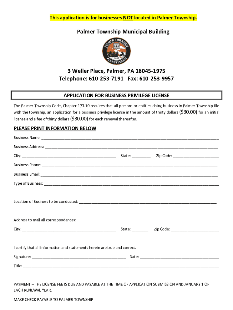This application is for businesses NOT located in Palmer Township. Palmer Township Municipal Building3 Weller Place, Palmer, PA 180451975