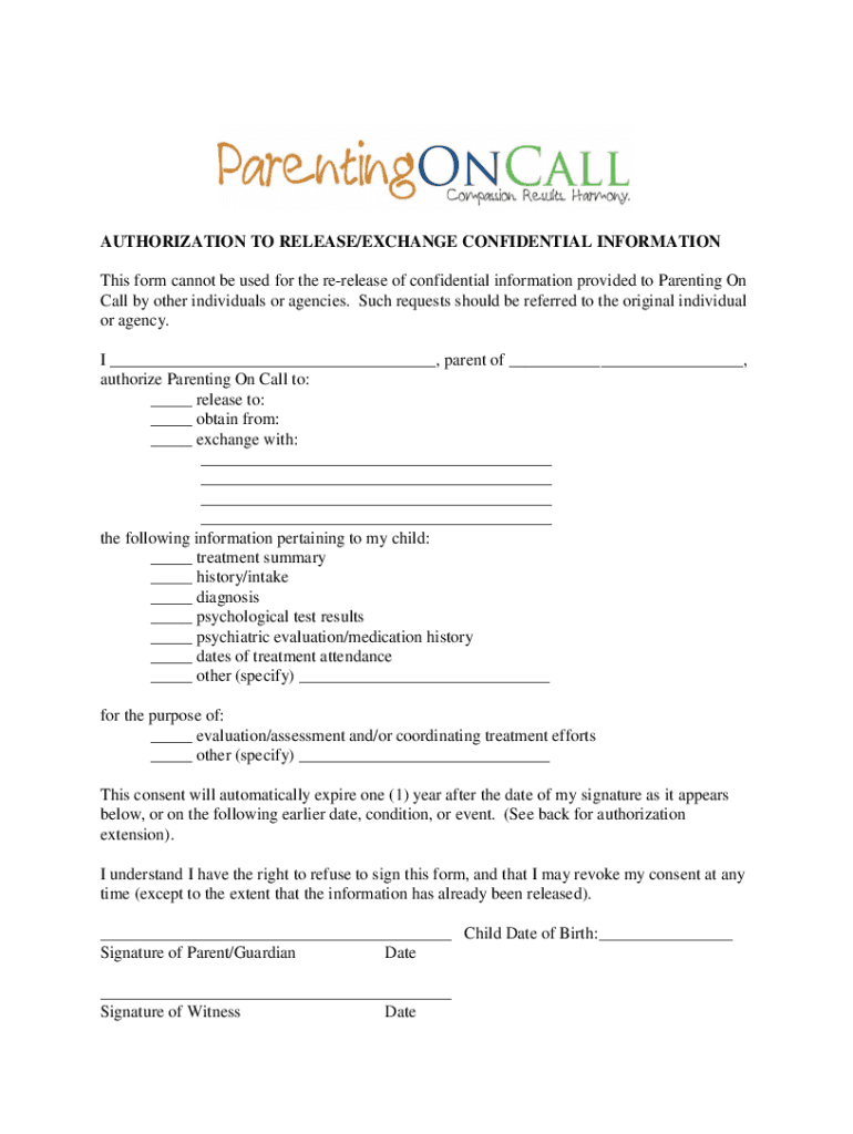 AUTHORIZATION TO RELEASE/EXCHANGE CONFIDENTIAL INFORMATION This form cannot be used for the prerelease of confidential information provided to Parenting On Call by other individuals or agencies. Such