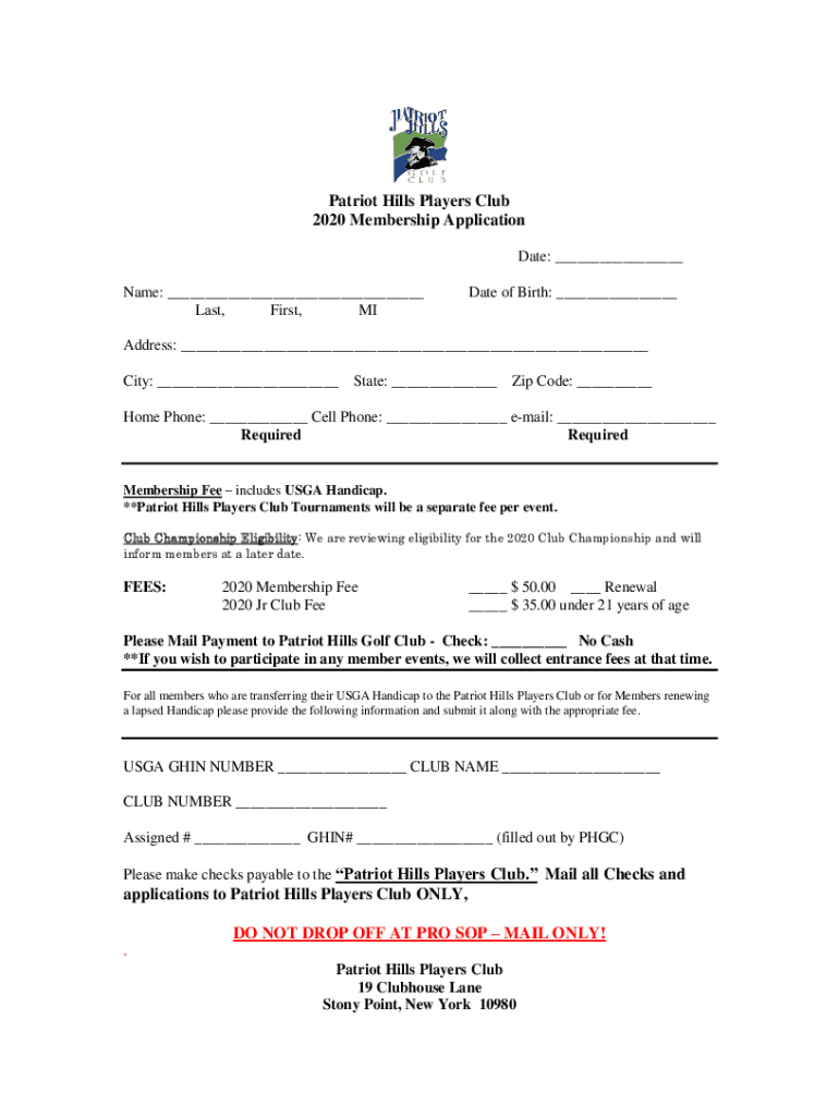 Patriot Hills Players Club 2020 Membership Application Date: Name: Last, First, IDATE of Birth: Address: City: State: Zip Code: Home Phone: Cell Phone: email: Required RequiredMembership Fee includes