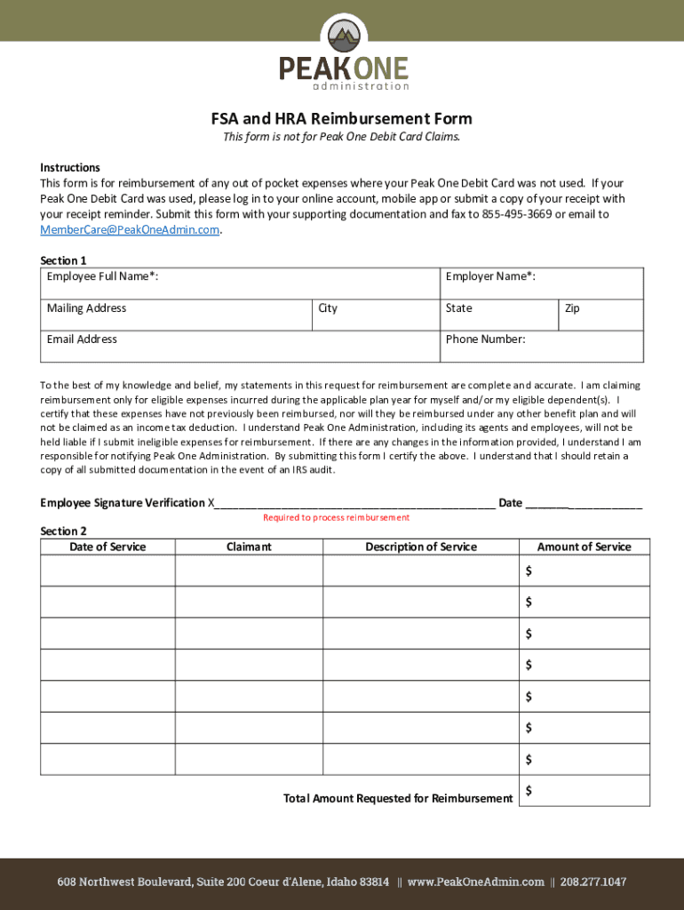 FSA and HRA Reimbursement Form This form is not for Peak One Debit Card Claims. Instructions You may also submit claims by logging in to your Peak One Portal at www.PeakOneAdmin.com or using your