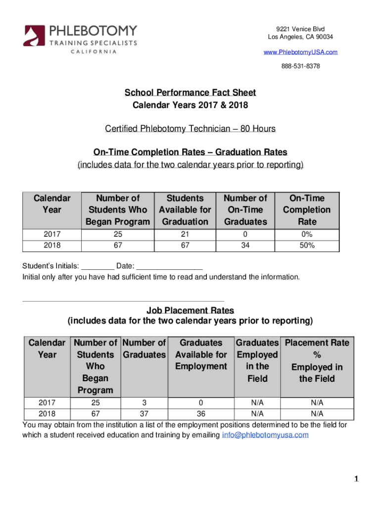 9221 Venice Blvd Los Angeles, CA 90034 www.PhlebotomyUSA.com 8885318378School Performance Fact Sheet Calendar Years 2017 & 2018 Certified Phlebotomy Technician 80 Hours Onetime Completion Rates Graduation
