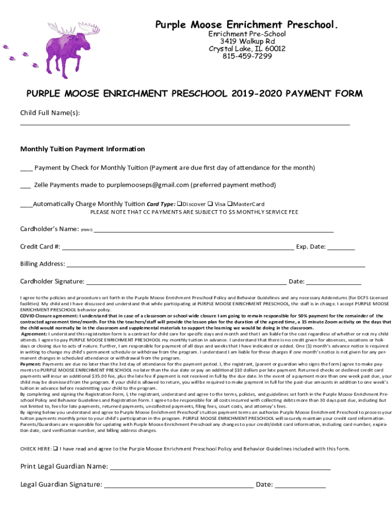 Purple Moose Enrichment Preschool. Enrichment Preschool 3419 Walk up Rd Crystal Lake, IL 60012 8154597299PURPLE MOOSE ENRICHMENT PRESCHOOL 20192020 PAYMENT FORM Child Full Name(s): Monthly Tuition