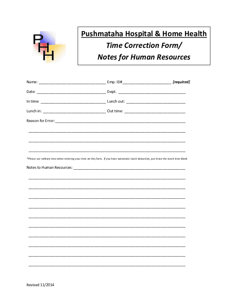 Pushmataha Hospital & Home Health Time Correction Form/ Notes for Human Resources Name: EMP. ID# required Date: Dept. In time: Lunch out: Lunch in: Out time: Reason for Error: *Please use military