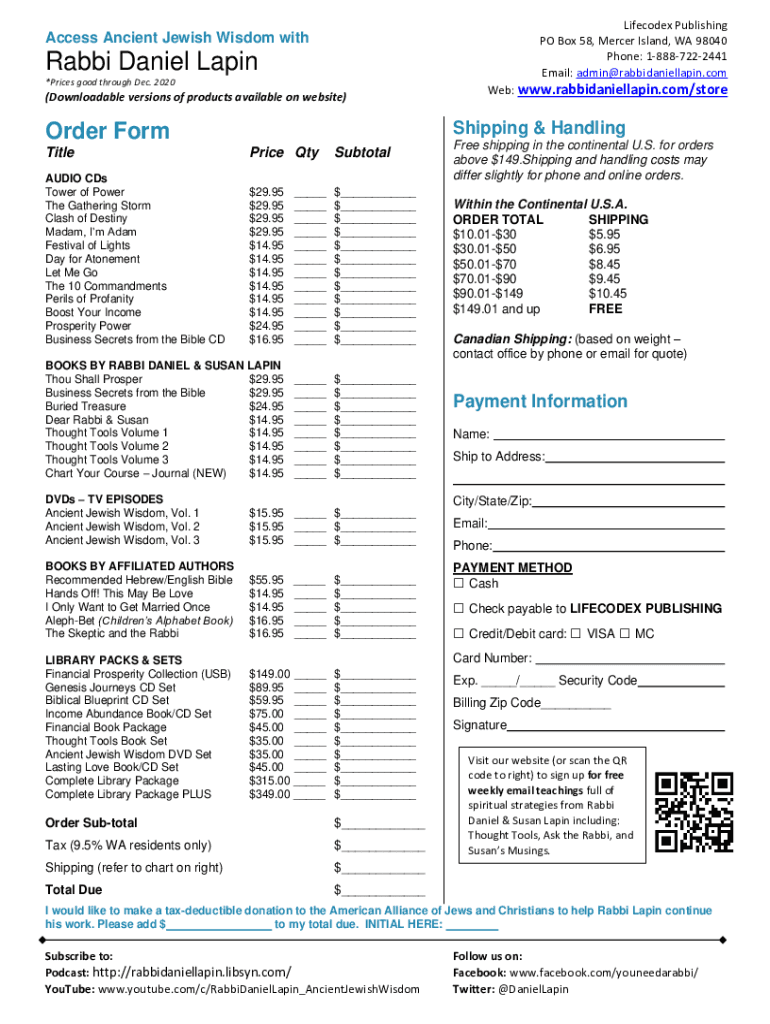 Life codex Publishing PO Box 58, Mercer Island, WA 98040 Phone: 18887222441 Email: admin rabbidaniellapin. Access Ancient Jewish Wisdom withRabbi Daniel Lapin *Prices good through Dec. 2020(Downloadable