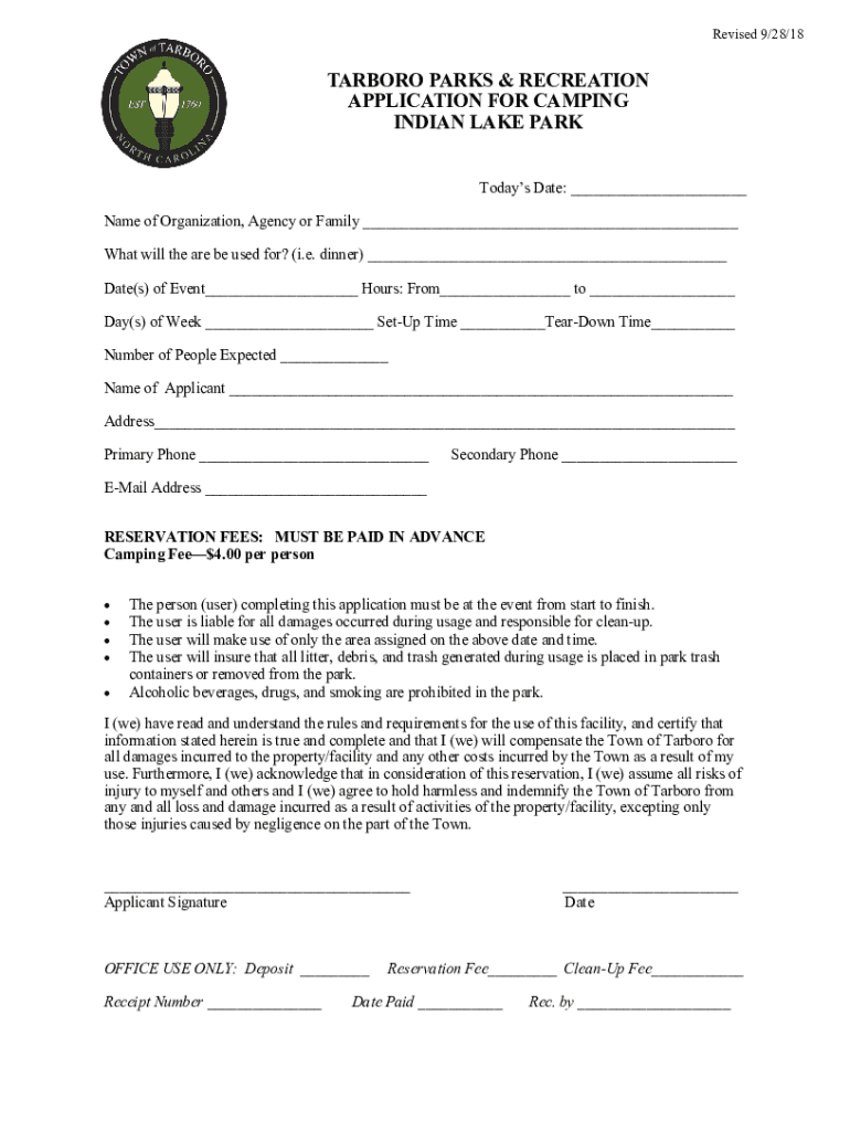 Revised 9/28/18TARBORO PARKS & RECREATION APPLICATION FOR CAMPING INDIAN LAKE PARK Today's Date: Name of Organization, Agency or Family What will they are been used for? (i.e. dinner) Date(s) of Event